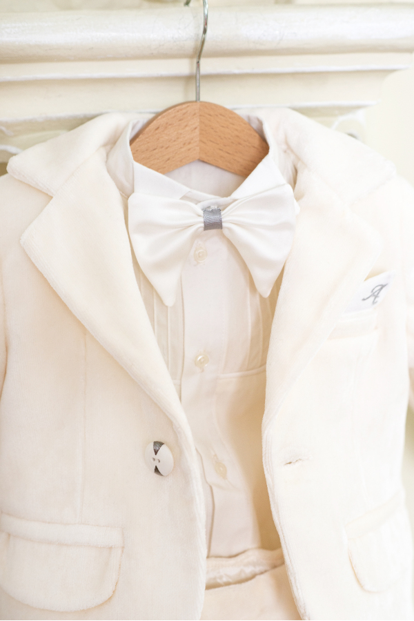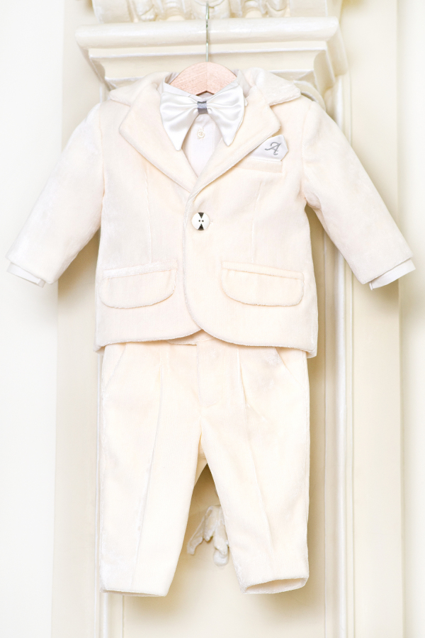 Frosty este un costum ivoire sofisticat, realizat din catifea de bumbac texturată luxoasă, cu monograma bebelușului brodată delicat pe batistă. Detaliile delicate și broderia elegantă fac acest design să iasă cu adevărat în evidență, ideal pentru un botez sau orice sărbătoare specială.