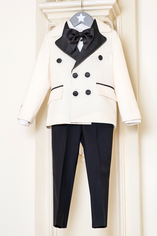Un costum elegant pentru băieți, realizat din țesătură alb-negru/fildeș, cu accente delicate de tafta, perfect pentru botezuri, zile de naștere, ședințe foto sau nunți. Detaliile subtile strălucitoare adaugă o notă de glamour, făcând din această ținută o alegere rafinată pentru orice ocazie specială.