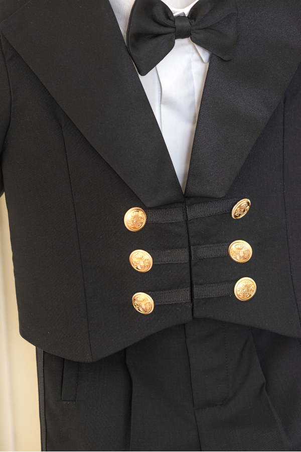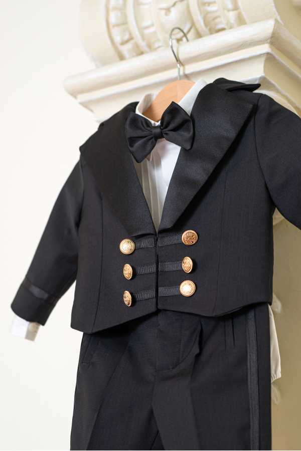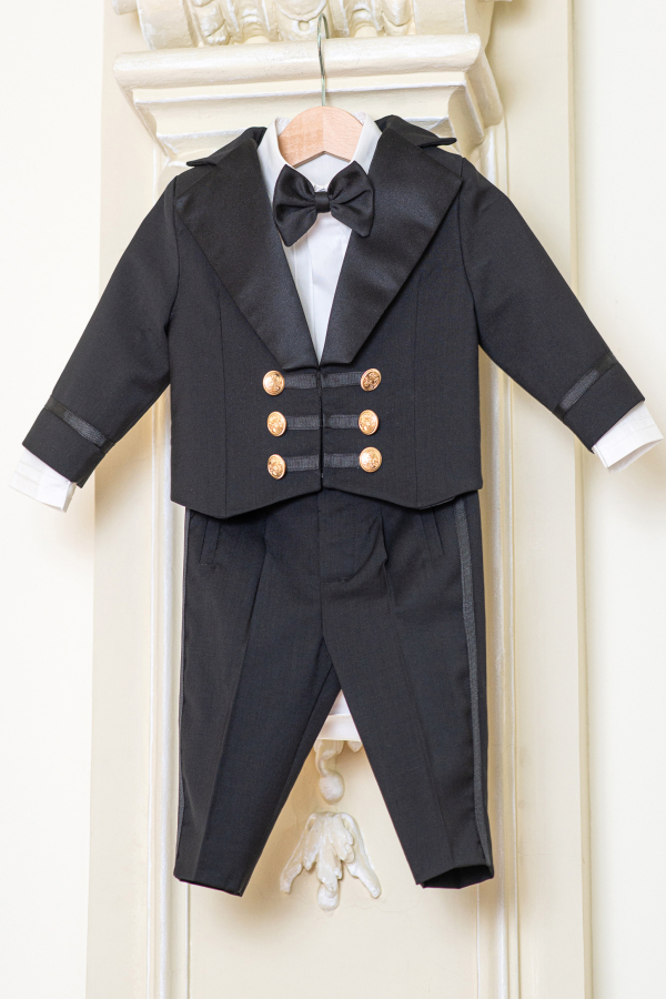 Un costum elegant pentru baieti, croit din stofa neagra si decorat cu nasturi aurii,perfect pentru botezuri, zile de nastere, sedinte foto, sau nunti. Costumul este frumos completat cu benzi delicate și un papion fermecător, adăugând o notă de rafinament acestei ținute rafinate.