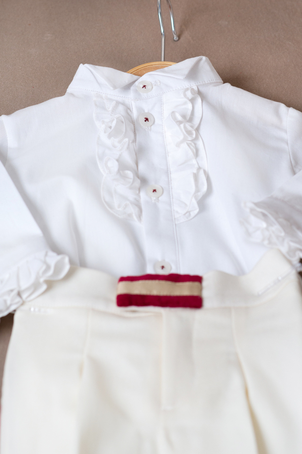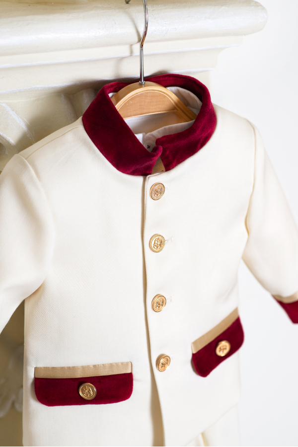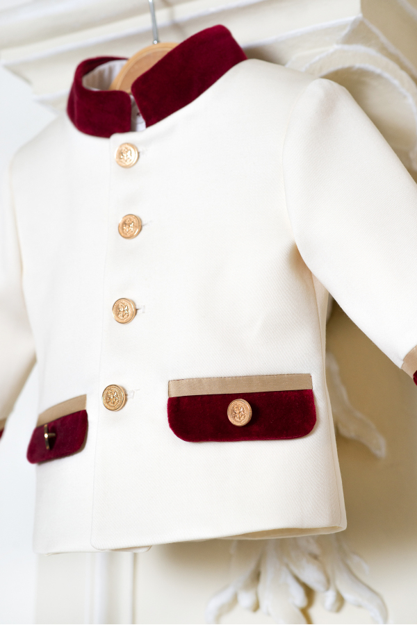 Un costum plin de poveste, o ținută impresionantă ... Realizat într-o combinație deosebită de grena și ivoire, acest costum va atrage toate privirile. Detaliile aurii adaugă un plus de eleganță și rafinament, transformând această ținută într-o apariție memorabilă.