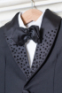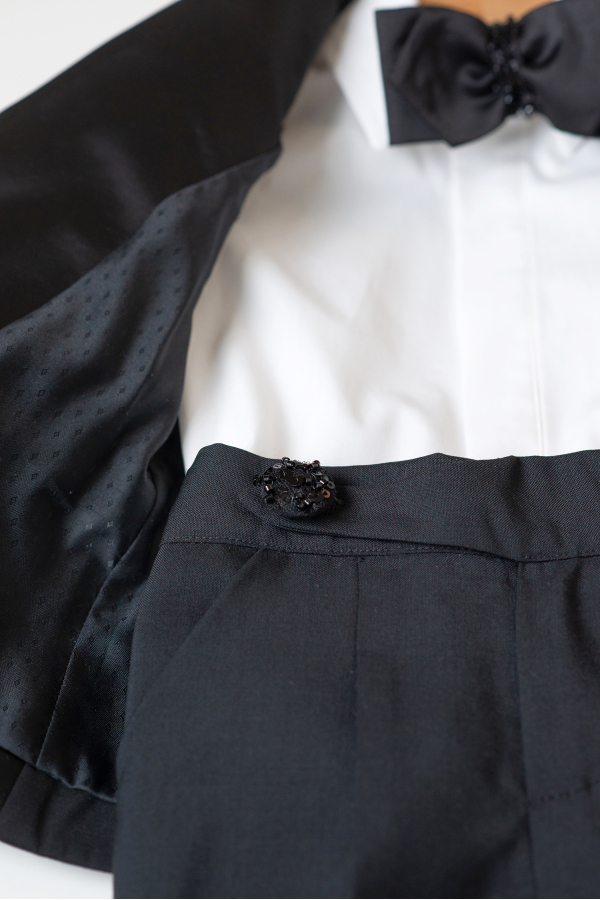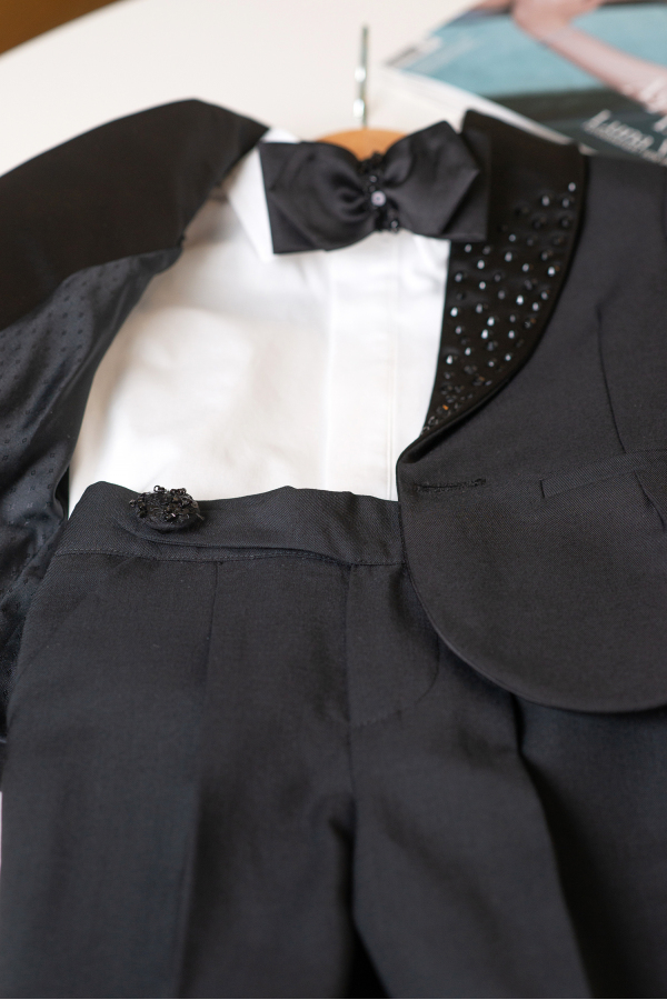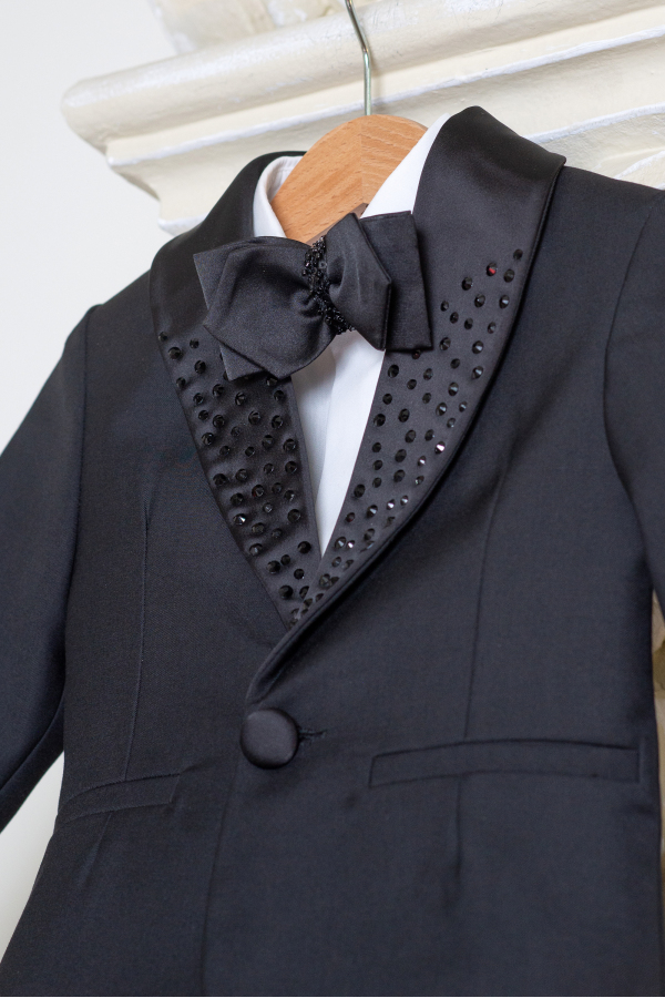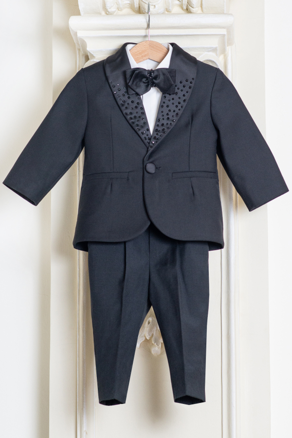 Un costum elegant pentru baieti, croit din stofa neagra si decorat cu strasuri negre pe rever, lipite manual. Costumul este frumos completat de un papion fermecător decorat si acesta cu strasuri negre.