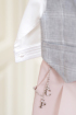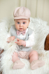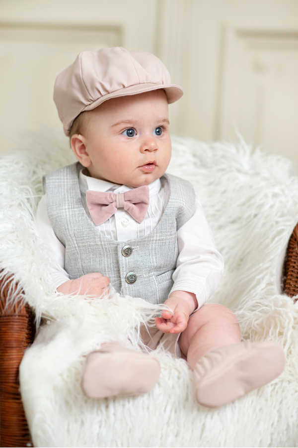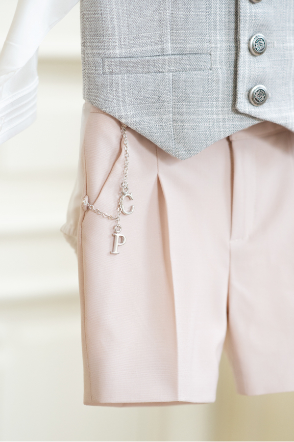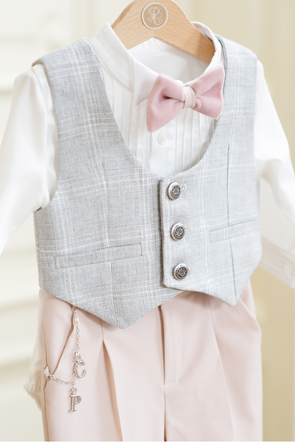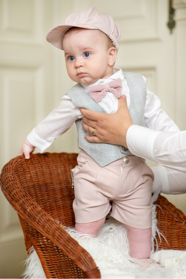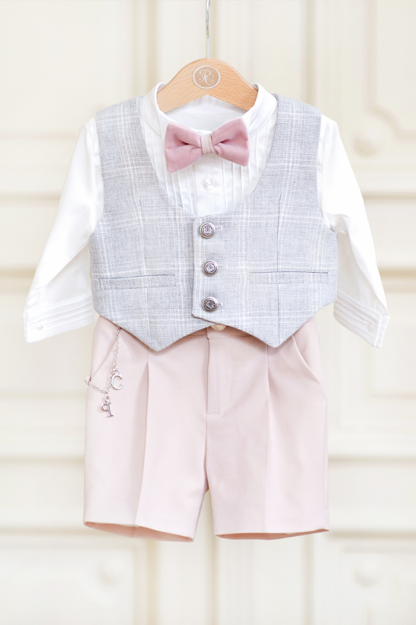 Costum pentru baieti si bebelusi din stofa moale, format din vesta si pantaloni scurti intr-o nuanta delicata de roz prafuit. Camasa este decorata pe mansete si piept cu cusaturi fine, iar papionul din catifea, intregeste aceasta tinuta chic.