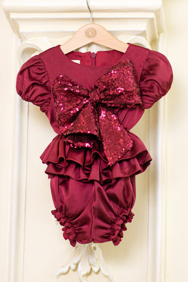 Body elegant si stralucitor, decorat cu volane si o fundita supradimensionata din paiete, intr-o nuanta minunata de rosu inchis, Bordeaux. Aceasta este o ținută extravaganta, dar ușor de purtat pentru cei mici, ideală pentru o ședință foto sau pentru o petrecere caldă de Crăciun în familie.