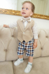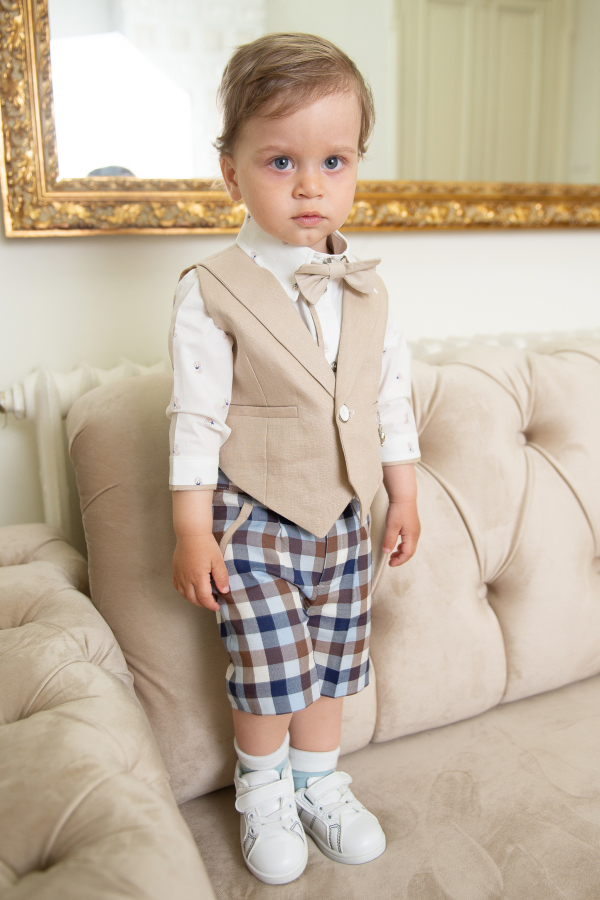 Costum de vara pentru copii, format dintr-o vesta, pantaloni scurti si o camasa haioasa cu imprimeu cu catelusi. Materialele usoare, fac din acest costum tinuta ideală pentru orice petrecere. Papionul ofera un plus de eleganta.