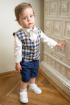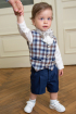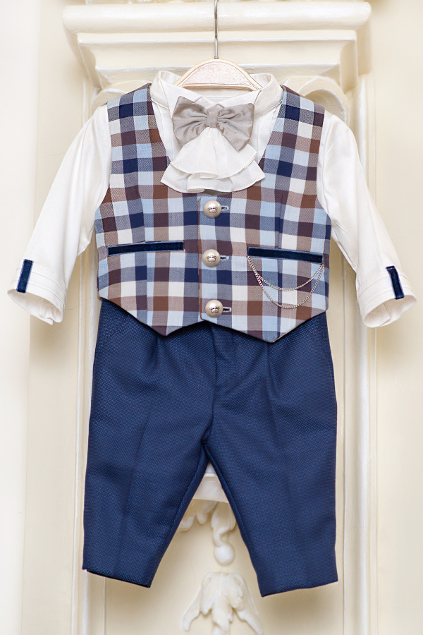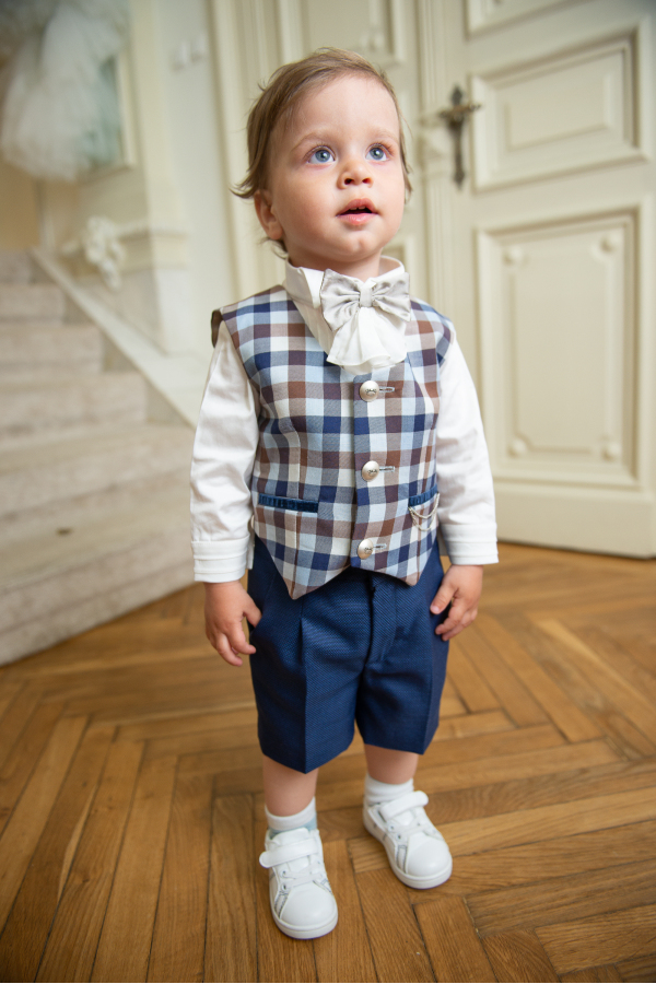 Costum elegant pentru baieti, cu un vibe aristocratic chic, dat de detaliile fine ale camasii si jaboul cu volane. Costumul are vesta in carouri si pantaloni scurti, perfect pentru a fi purtat in acest sezon calduros.