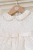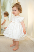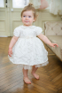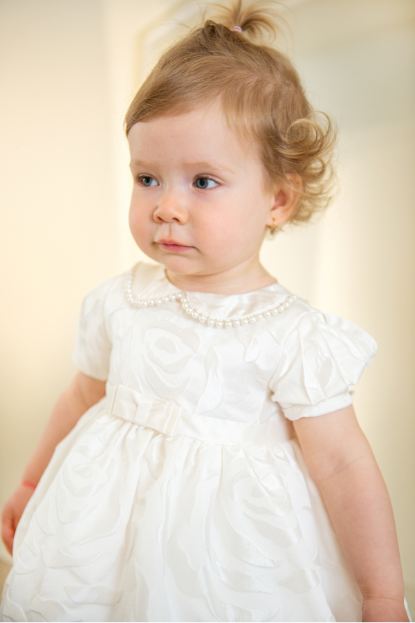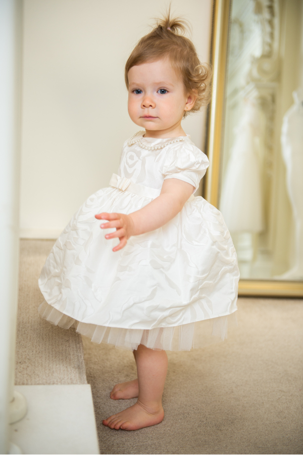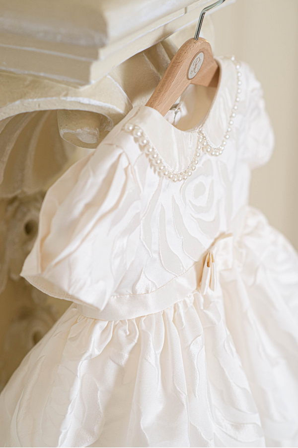 O rochie eleganta din brocart, cu un design floral delicat, perfecta pentru un botez regal. Perlele de la guleras, dau un plus de finete acestui model si o fac perfecta pentru o petrecere ca in povesti.