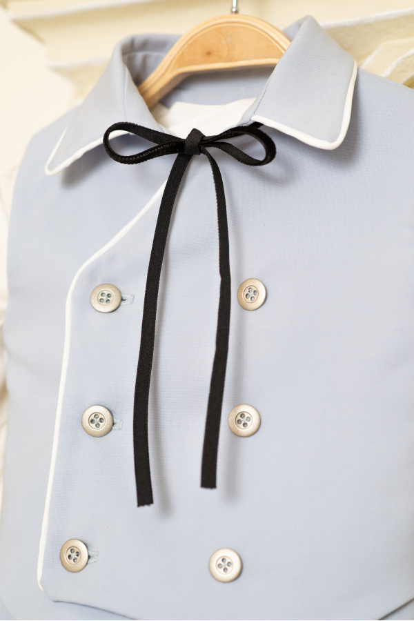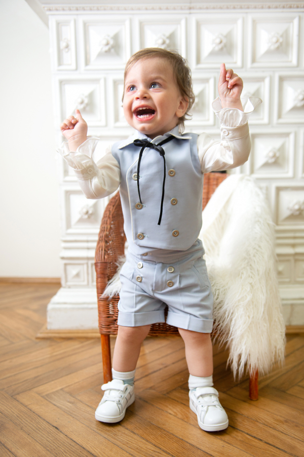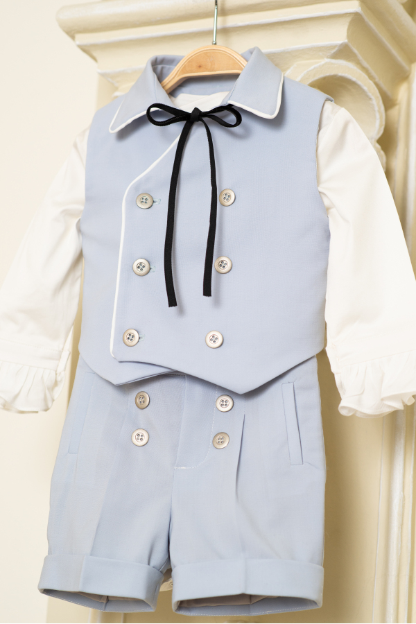 Costum delicat pentru baieti, intr-o nuanta deosebita de albastru. Camasa este brodata cu initiala micutului si decorata cu detalii fine din dantela macrame.