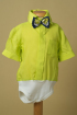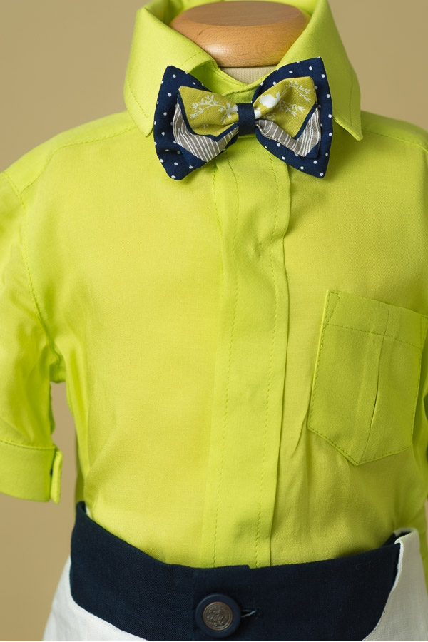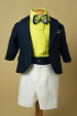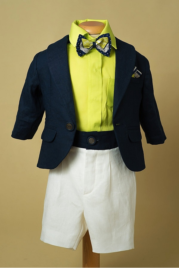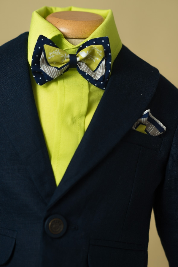 Costumas smart casual pentru botez sau ocazii speciale. Camasa este fluida intr-o nuanta vesela de vede lime cu maneca scurta, sacoul elegant slim fit iar pantaloni scurti sunt lucrati din in cu accente bleumarin in talie. Colectia "Gentleman's Time".