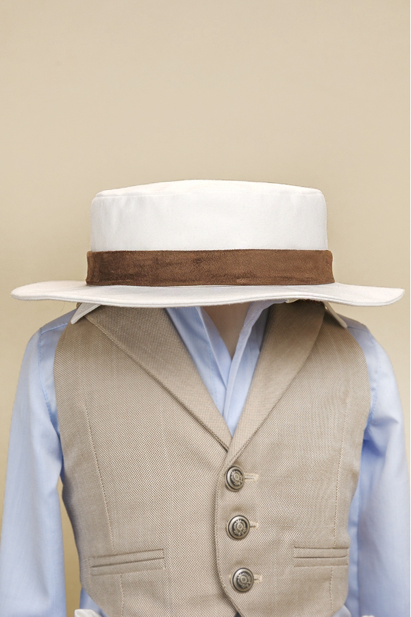 O palarie retro chic din stofa ivoire decorata cu o banda colorata, pentru un veritabil Gatsby Look. Palaria poate fi facuta in nenumarate combinatii de culori. Pentru detalii, va rugam sa ne contactati.