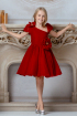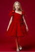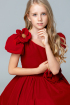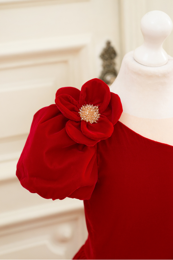 Elegant Poppy - Rochie din catifea rosie matasoasa, decorata cu flori supradimensionate si strasuri aurii