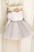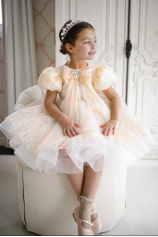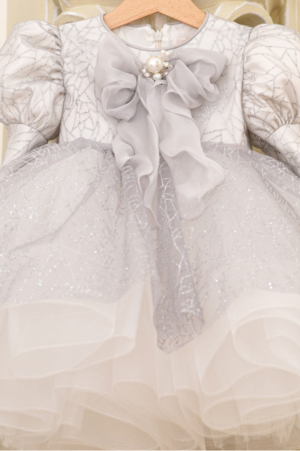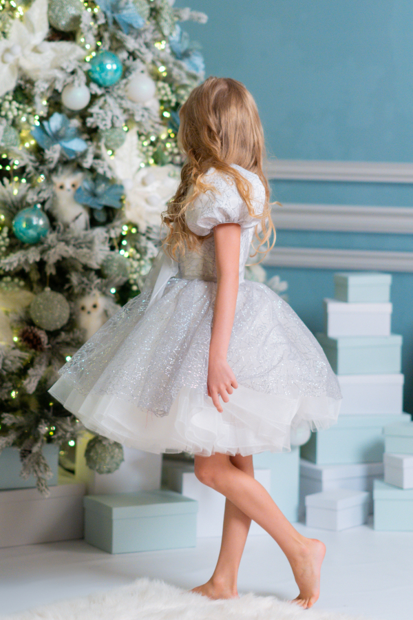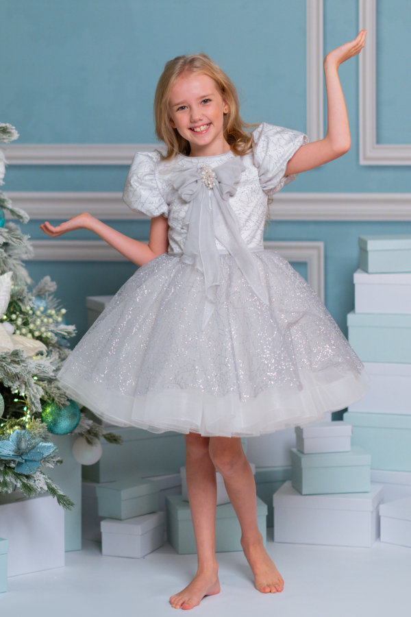 O minunata rochie stralucitoare pentru fete, din tul sclipitor si decorata cu o fundita delicata din voal de matase si perle. Un design perfect pentru o mică prințesă. In acelasi timp o rochita perfecta pentru serbarile de iarna de la gradinita si scoala, precum si pentru sedintele foto si petrecerile de Craciun.