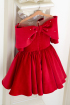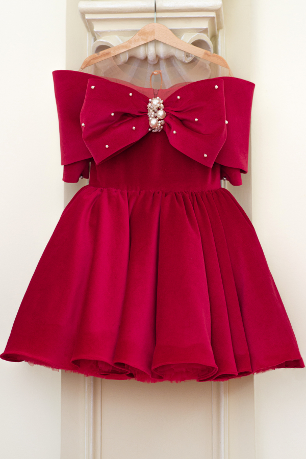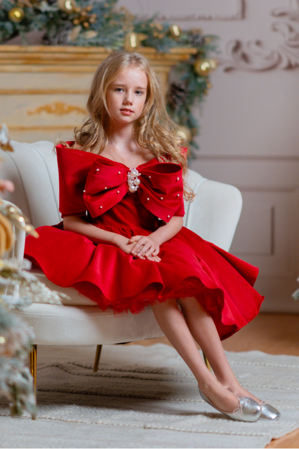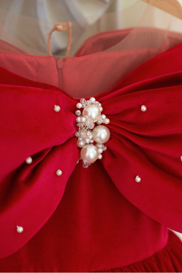 O rochie pentru copii wow din catifea de bumbac intr-o nuanta stralucitoare de rosu, cu perle cusute manual. Rochia are un design unic cu o funda mare care acopera umerii ca o capa delicata.