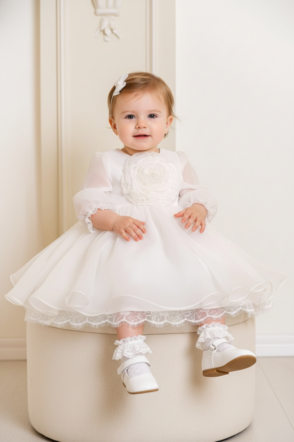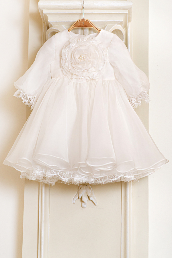 Dantela fina, organza din matase naturala, floare lucrata cu atentie si decorata cu perle... O combinatie delicata perfecta pentru o mica printesa. Acest model este potrivit atat pentru botez, cat si pentru o minunata domnisoara de onoare,