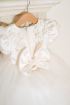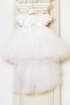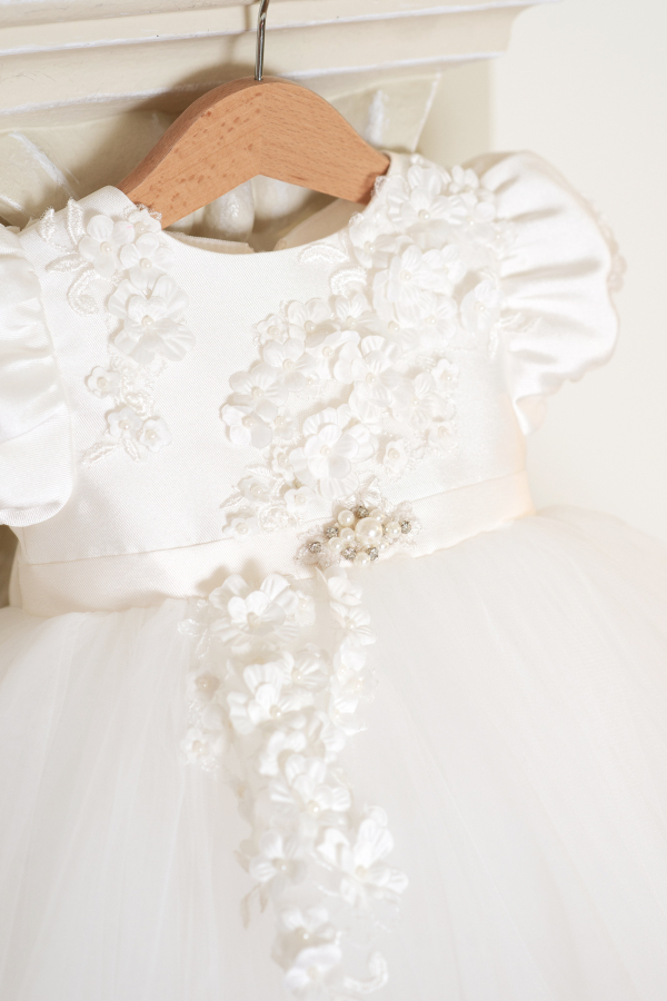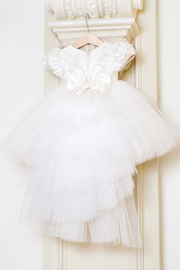 Buchete de flori, perle, fundițe, un tutu spectaculos și o trenă detașabilă – acestea sunt elementele unei ținute de neuitat. Broderia 3D cu flori delicate conferă rochiței diafane un aer regal, perfect pentru momente speciale.