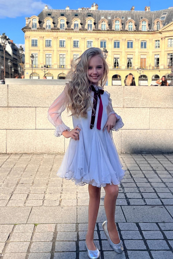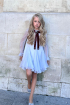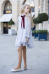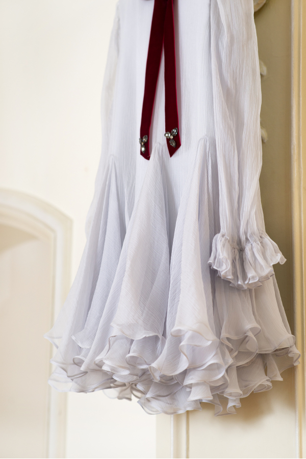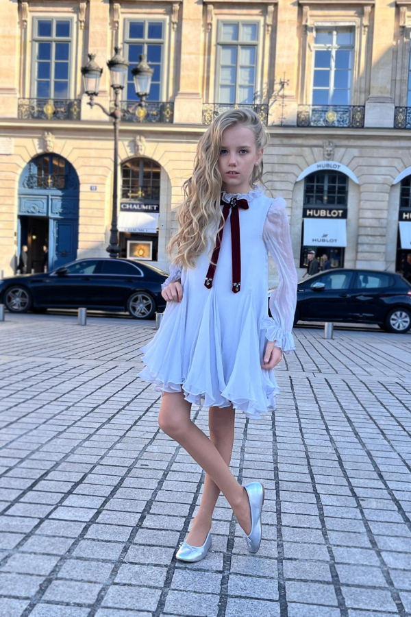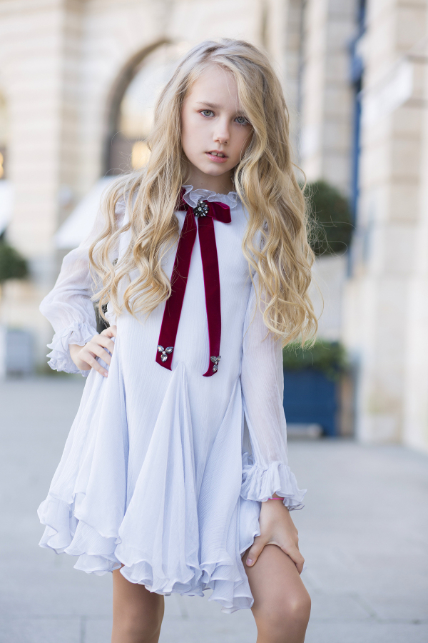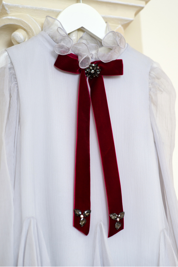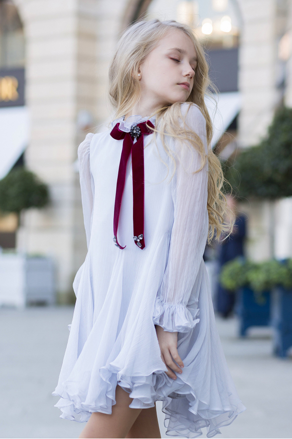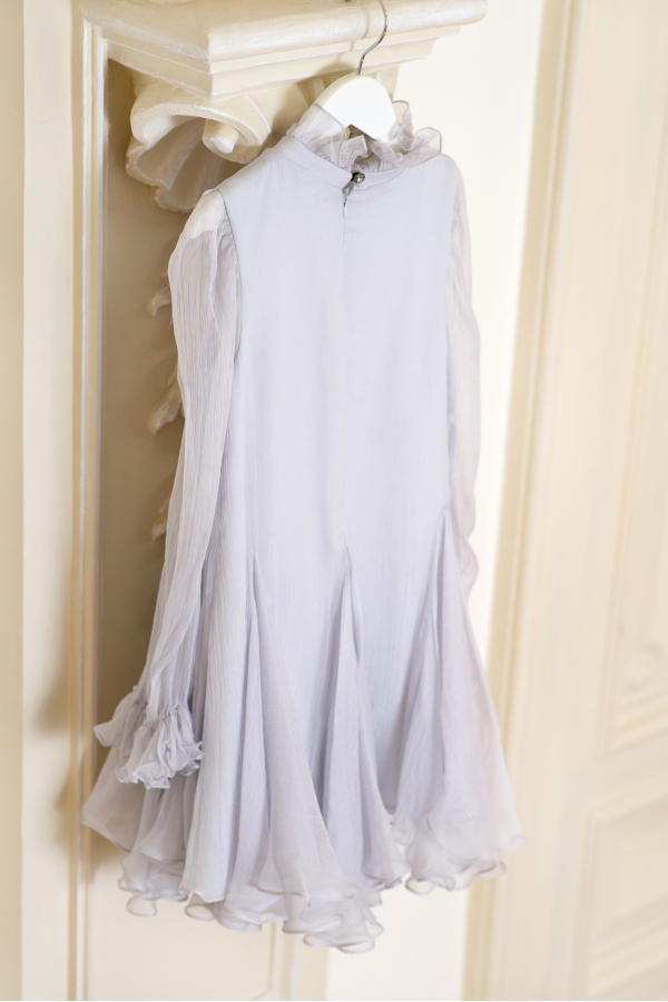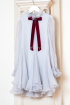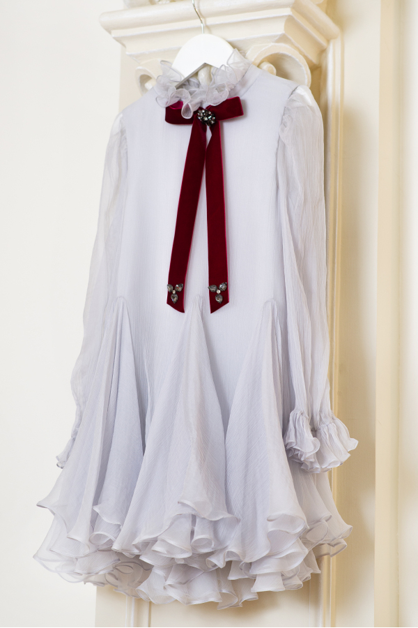O rochie diafana realizata din voal de matase pretios si decorata cu detalii din catifea si strasuri cusute manual. Nuanta delicata de gri face un contrast minunat cu tonul inchis al funditei. Sclipirea strasurilor fac din acest design un model perfect pentru sarbatori si petreceri.