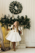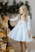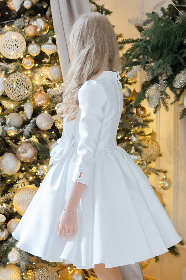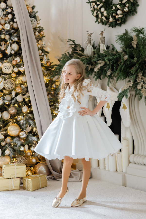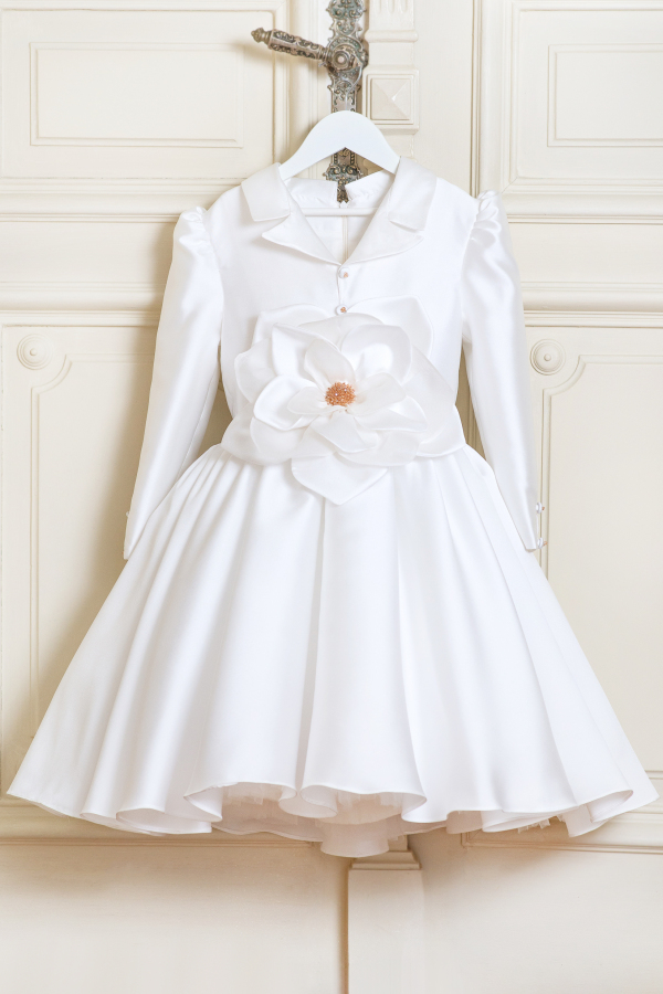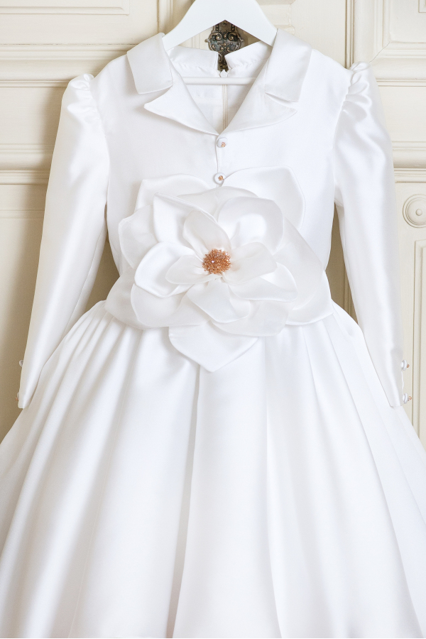 MiaMia - Rochie copii off-white din tafta Mikado, cu o floare supradimensionata si detalii aurii