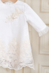 Rochita fetite pentru botez sau ocazie, realizata din voal de matase brodat, pe nuante de ivoire. Un model delicat, usor de imbracat datorita fermoarului de la spate. Rochita are si trusou de botez asortat si accesorii.
