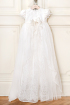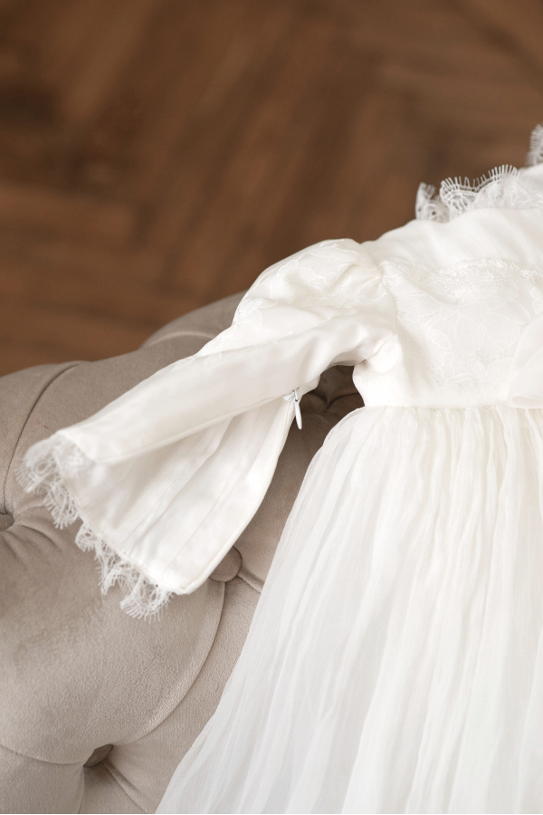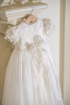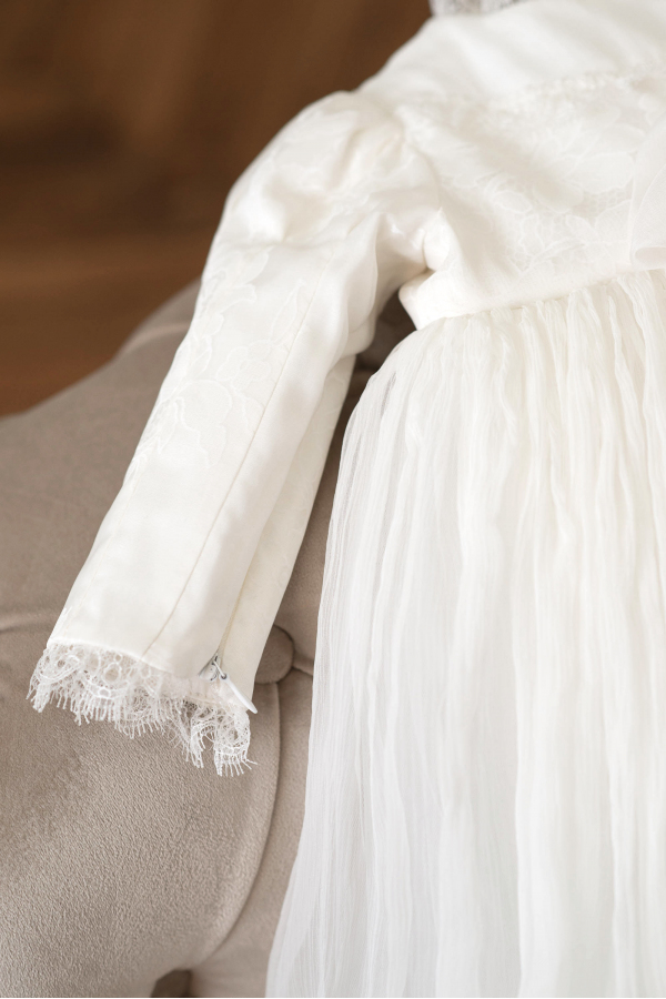 Rochita de botez realizata in stil catolic, din voal de matase naturala si organza de matase cu print floral, un model regal pentru un eveniment unic in viata.