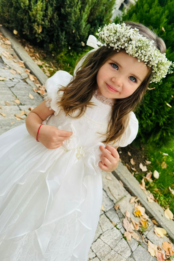 O rochie de botez incantatoare creata pentru fetite, realizata din sifon rafinat de matase naturala si organza de matase. Această tinuta cu design complex, prezinta dantela fina, o fundă incantatoare si perle, oferind un plus de gratie zilei importante a micutei voastre.