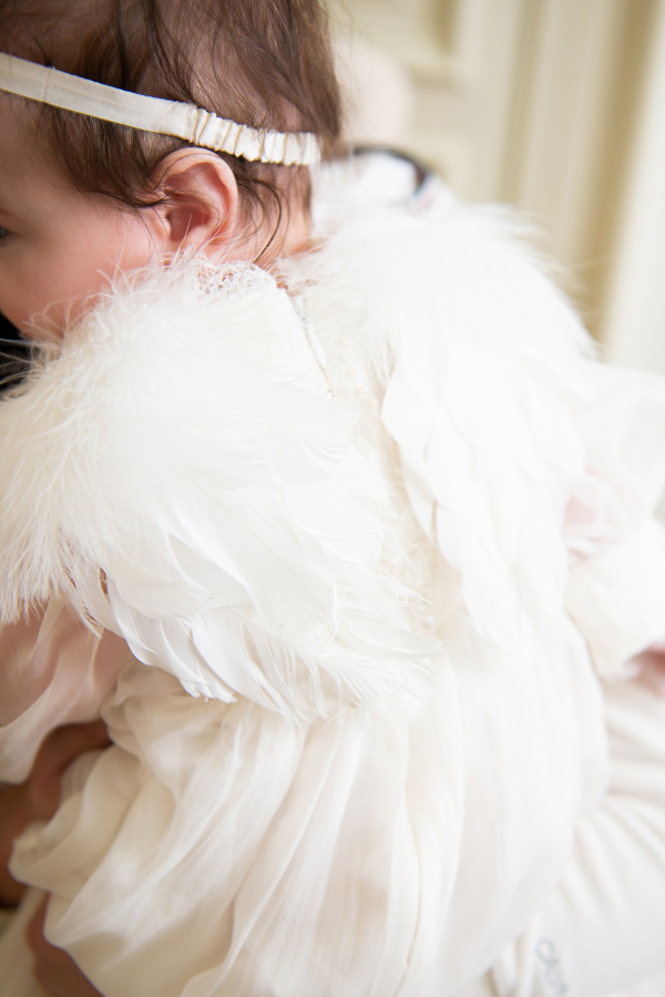 Rochie de botez pentru bebelusi, realizată din cel mai fin voal și dantela Chantilly de matase. Un model pretios, moale si fluid, in care bebelusa va simti mangaierea fina a matasii. Bustul este decorat cu perle, iar pe spate are o pereche delicata de aripi de ingeras.