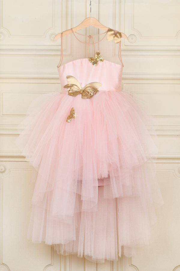 Rochita tutu pentru fete, cu volane asimetrice de tul si bust cu umeri transparenti, neagra, decorata cu fluturi stralucitori aurii. Un model care cu siguranta va atrage privirile celor din jur ;) Colectia "Special Moments".
