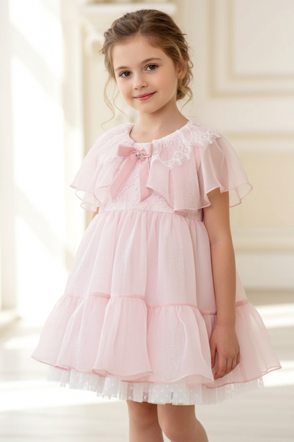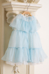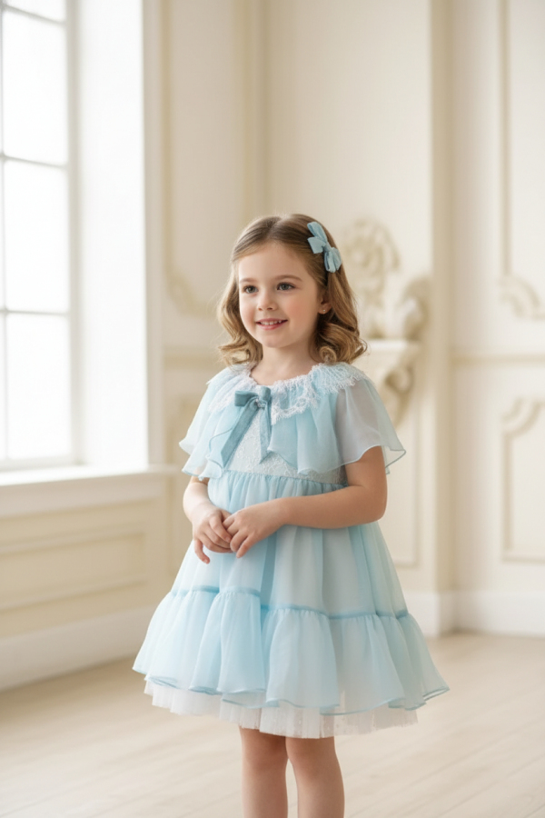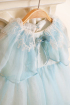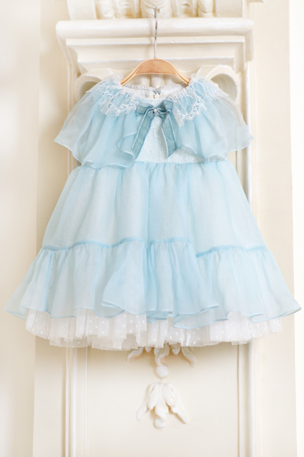 Rochie elegantă de vară realizata din voal de matase intr-o nuanta delicata de bleu și dantelă de matase Chantilly. Rochia are un un strat de tull cu buline si o fundita minunata din catifea pentru a completa acest design delicat.