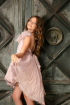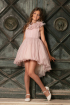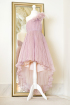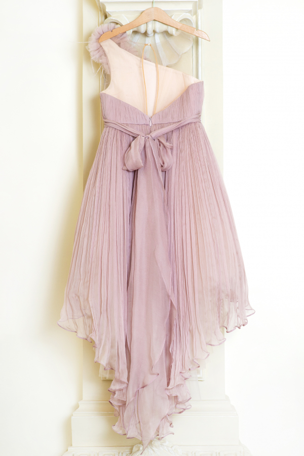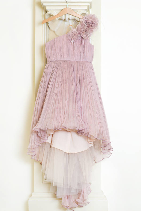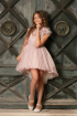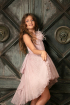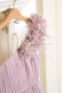Rochita vaporoasa din voal de matase naturala, cu spatele acoperit cu tul nude si decorata cu flori lucrate manual din voal netivit si pene. O tinuta deosebita pentru o mica domnisoara.
