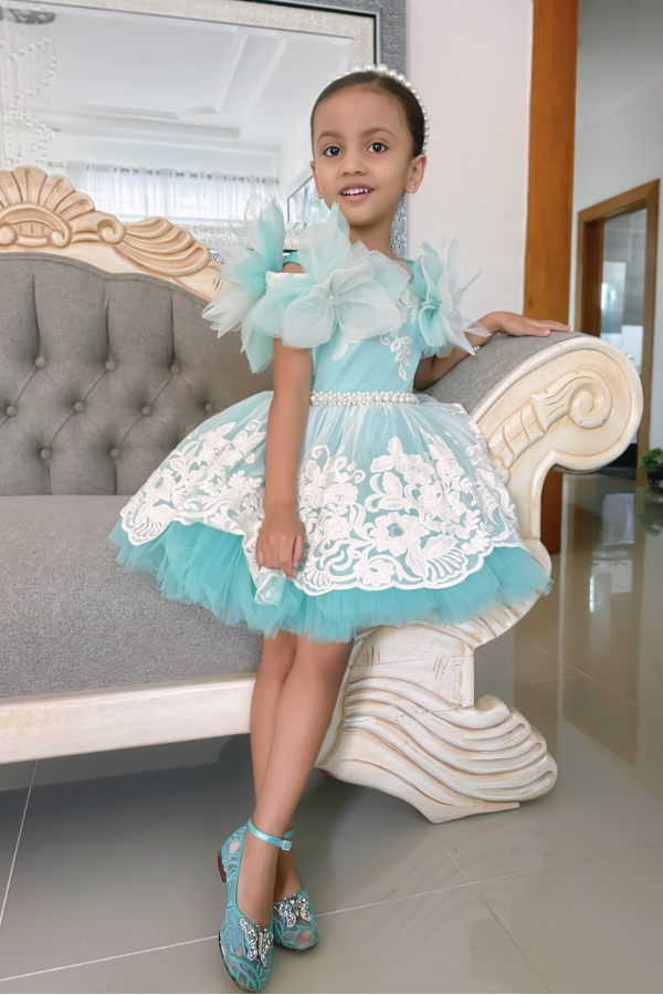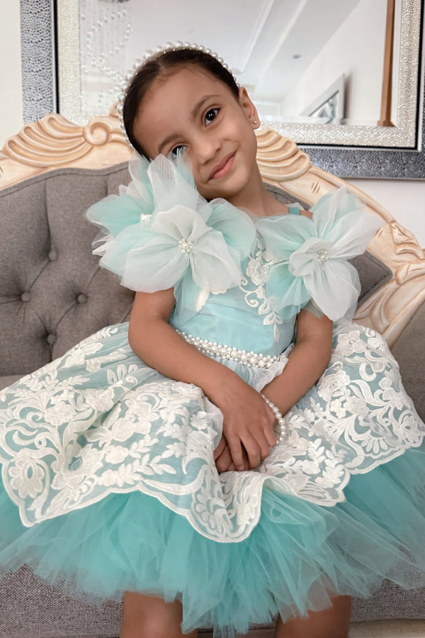 Rochie tutu pentru fetite si adolescente, realizata din voal brodat de matase naturala cu motive florale si straturi de tul colorat. Rochita este decorata cu patru flori mari, lucrate manual, perfecte pentru o tinuta chic. Un model creat cu gandul la adolescenti, care insa se potriveste perfect si pentru micutele domnisoare!