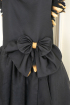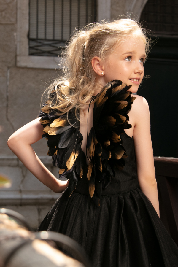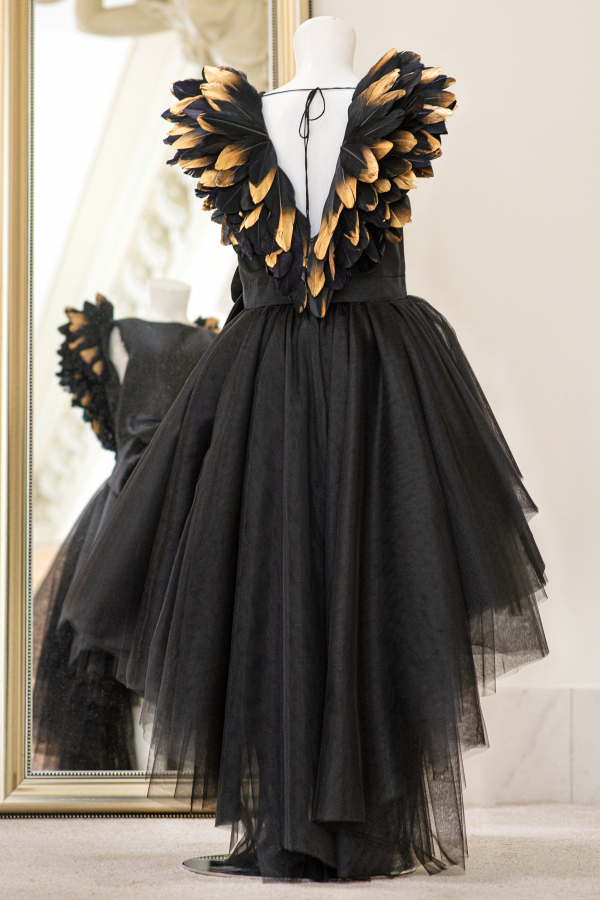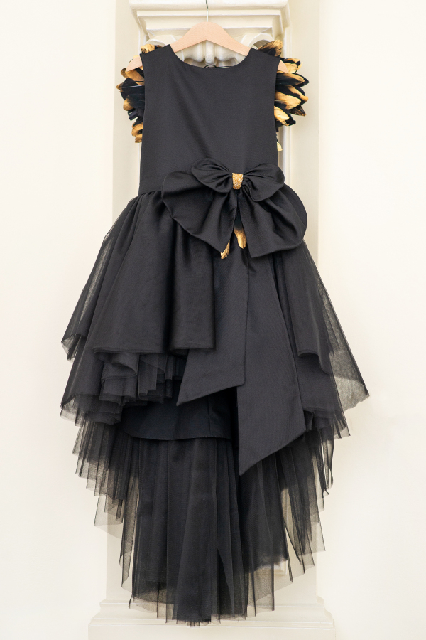 Aceasta tinuta emana eleganta prin paleta sa de culori pretioase, in timp ce trena si aripile cu pene adaugă delicatete si unicitate. Este o alegere perfectă pentru o domnisoara indrazneata. Corsetul este decorat cu o funda delicata si margele aurii. Aripile realizate manual din pene negre și aurii, adauga o nota diafana rochitei, intruchipand un echilibru intre angelic și mister.