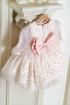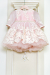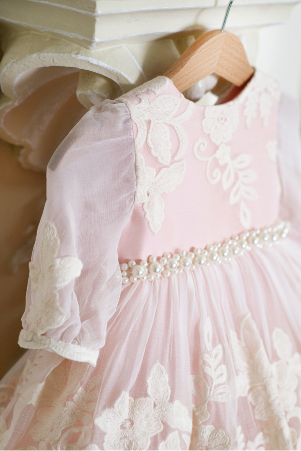 O creatie fermecatoare si foarte delicata pentru fetite, aceasta rochie adorabila este realizata din voal de matase brodat cu flori si straturi diafane de tul. Rochia are o nuanta minunata de roz si ivoire si maneci fine transparente. Banda cu perle ofera o notă de glamour, facand din aceaasta tinuta alegerea ideala pentru o adevarata printesa.