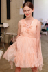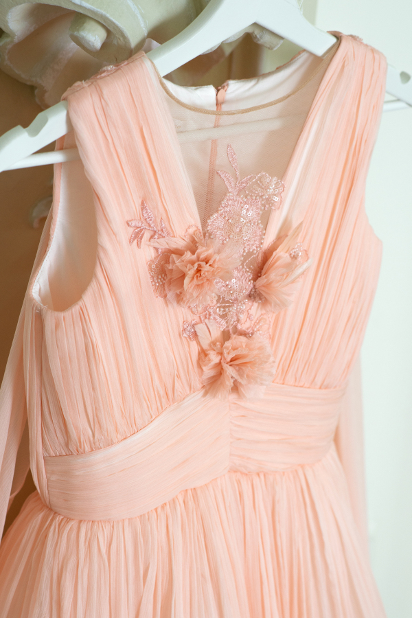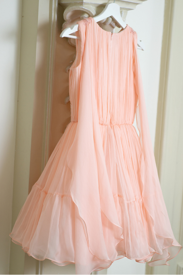 Un design incantator pentru fete, realizat din voal de matase creponat, intr-o nuanta minunata de somon si decorata cu flori delicate de dantela. Aripile din matase adauga un strop de magie acestei tinute diafane, perfecta pentru o zi caldusoasa de vara