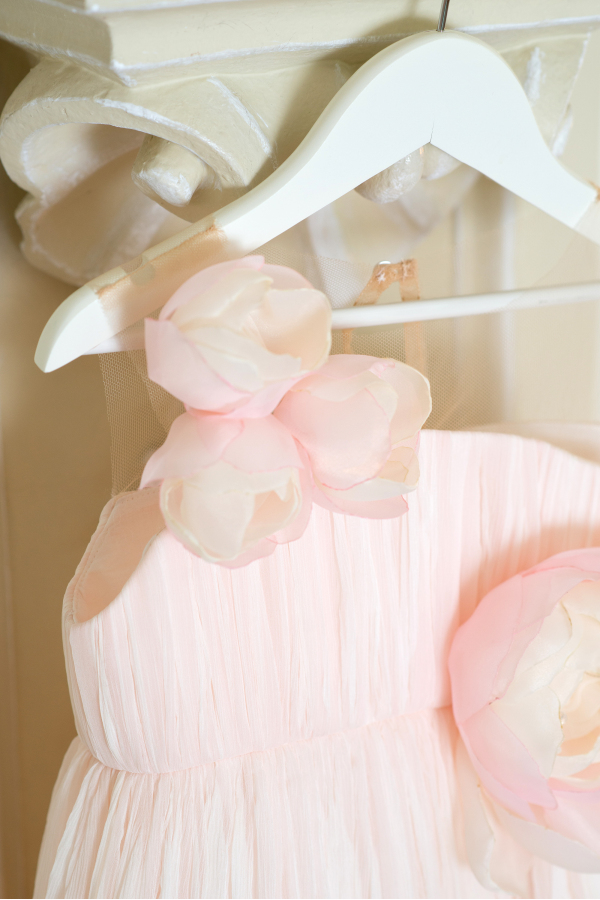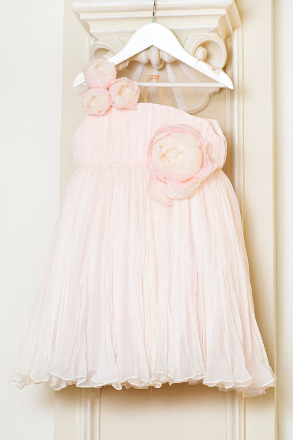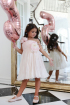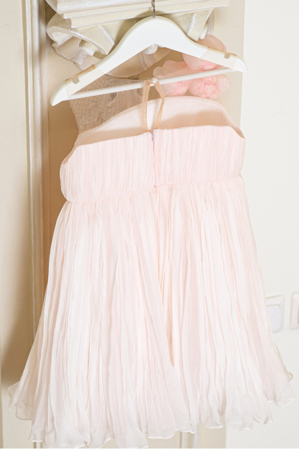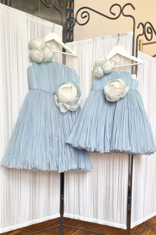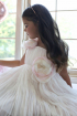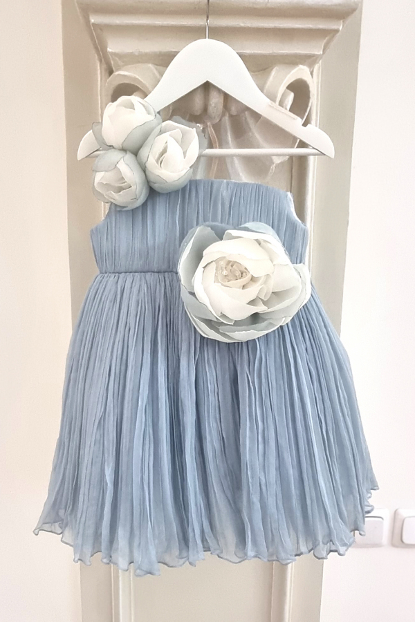 Rochita vaporoasa din voal de matase naturala, placuta la atingere si usor de purtat. Modelul are bustul relizat din tul nude si este decorat cu flori in forma de trandafir lucrate manual. O rochita minunata pentru domnisoarele de onoare sau pentru o aniversare!