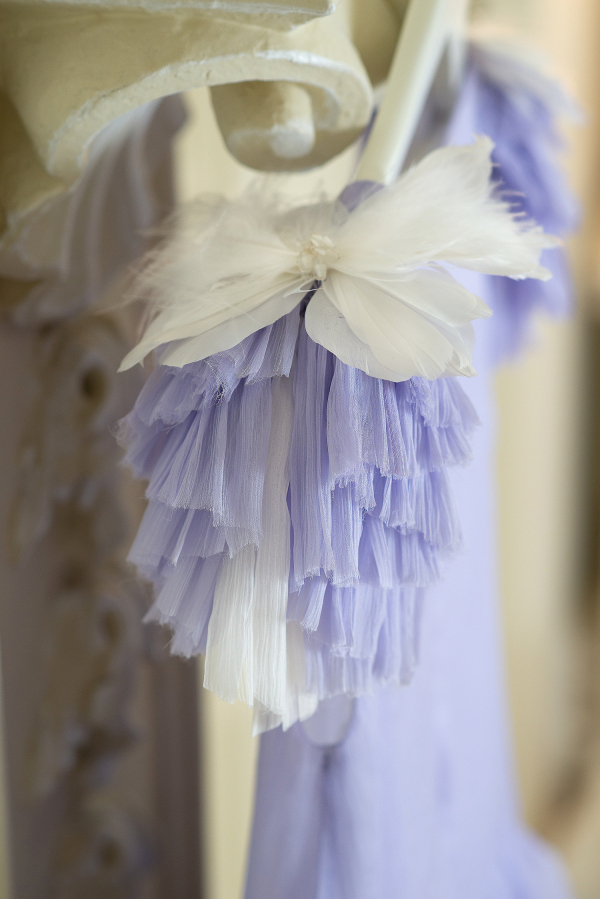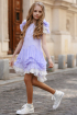 O rochie mini de vis, realizata din straturi nesfarsite de voal de mătase lila și ivoire, creând o siluetă delicata și fluidă. Rochia este împodobită pe umeri cu fluturi rafinați realizati din pene si volane netivite. Un design perfect pentru cei care caută un look delicat și fermecător pentru ocazii speciale.