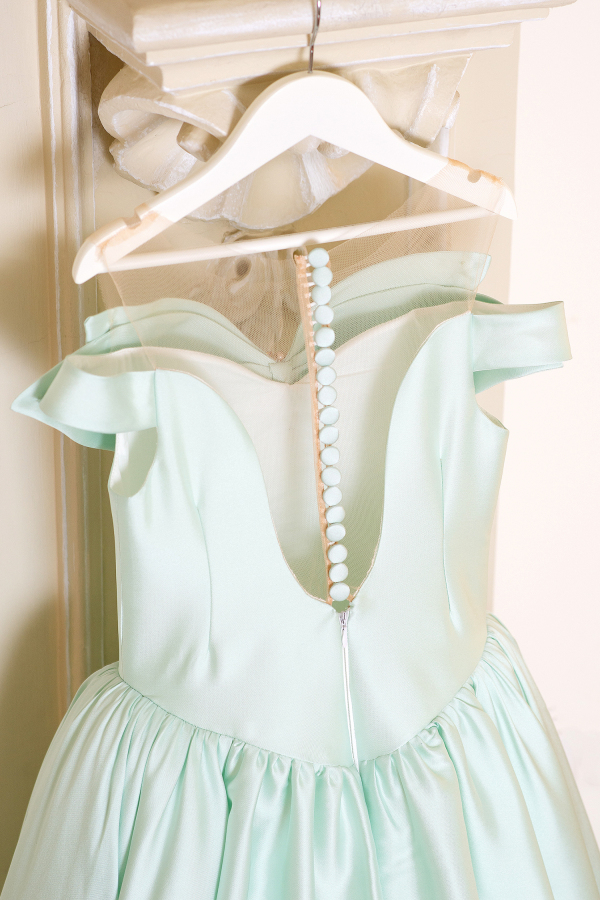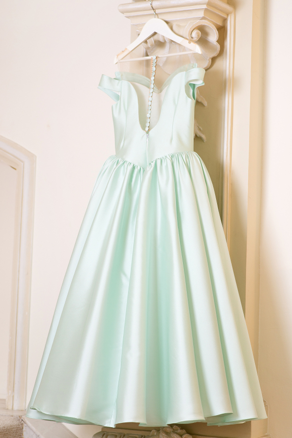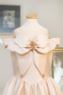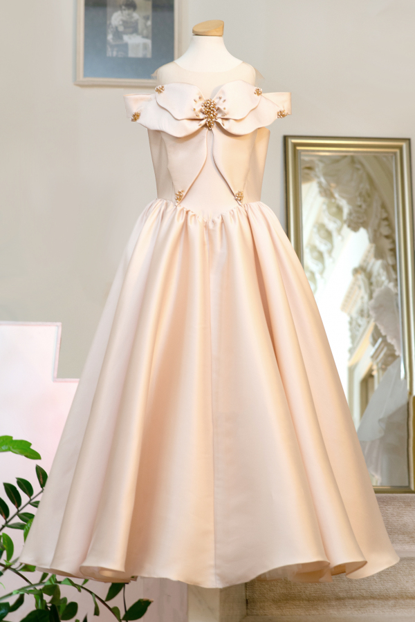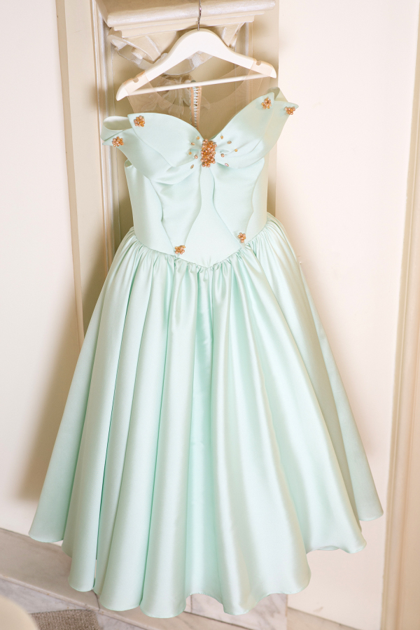 Textura minunata a taftalei, combinată cu o croială neasteptata, creează un design sofisticat. Fluturele realizat manual adaugă o notă plină de farmec, în timp ce perlele aurii îi sporesc eleganța. Contrastul dintre culoarea delicata și accentele aurii aduce o nota îndrăzneață, dar rafinată, făcându-l perfect pentru ocaziile speciale în care stilul și încrederea sunt în centrul atenției.