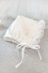 Rochita de botez realizata in stil catolic, din voal de matase naturala si organza de matase cu print floral, un model regal pentru un eveniment unic in viata.