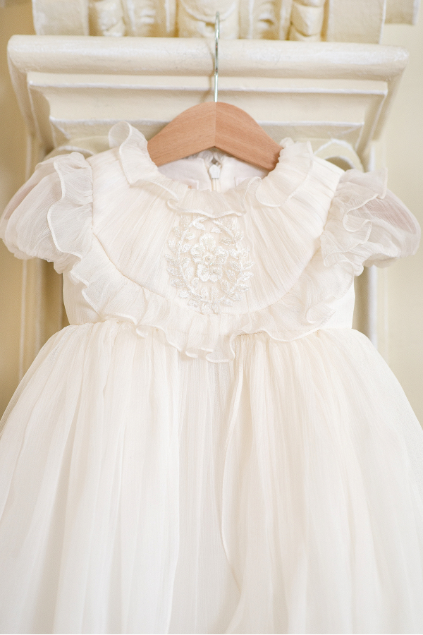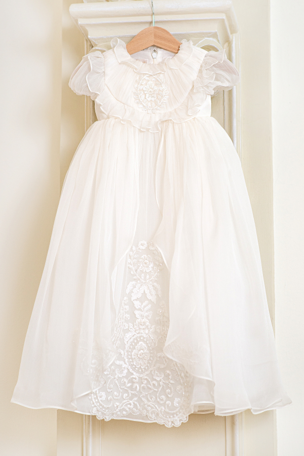 Rochie de botez pentru fetite in stil catolic, din voal creponat de matase cu aplicatii fine din dantela brodata cu margele. Volanele delicate ii dau acestui design un aer racoros si potrivit pentru vara. Mânecile scurte și transparente completează acest model cu aer regal.
