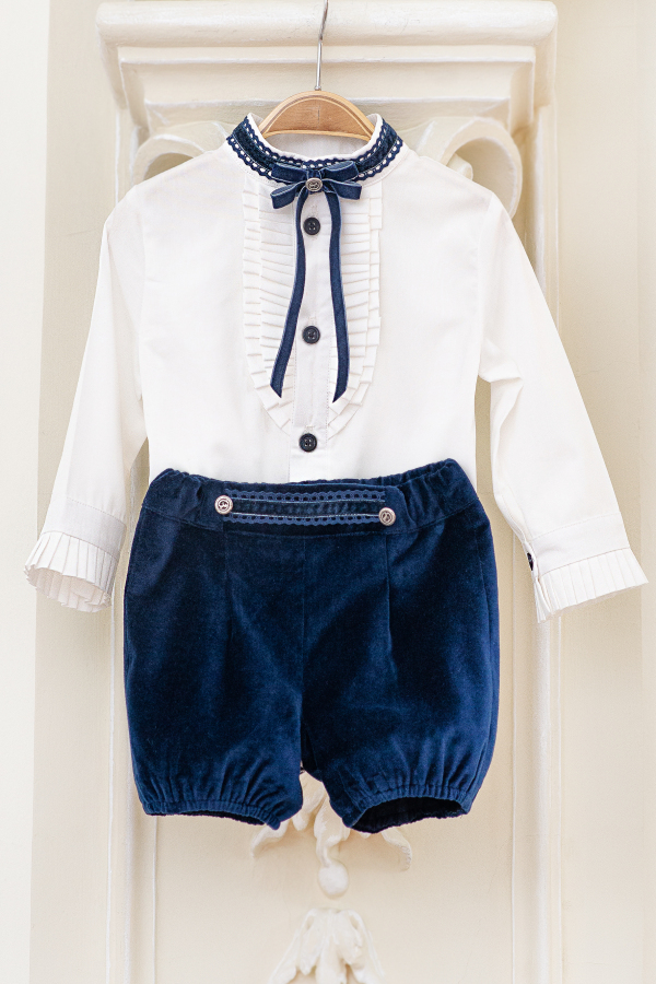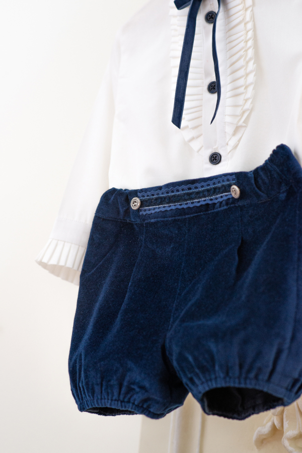 Un costum elegant cu o camasa eleganta, într-o combinatie minunata de ivoire si bleumarin, este o alegere atat de perfecta. Pantalonii scurti si funky, fac din acesta, un costum comod, tocmai perfect pentru orice petrecere sau sedinta foto