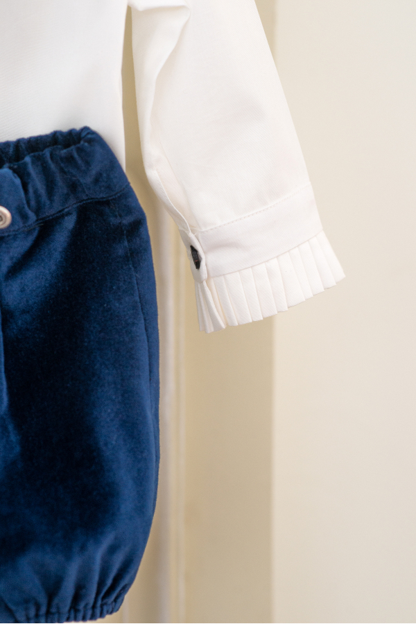 Piese: camasa cu body (pentru masurile 0-1an) si papion, pantaloni scurti.
