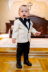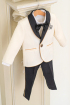Un costum intr-o combinatie clasica de ivoire si negru, cu un plus de glamour dat de detaliile aurii. Sacoul se personalizeaza cu initialele baietelului.. Un model perfect pentru sarbatorile de iarna, nunta sau botez!