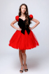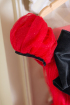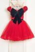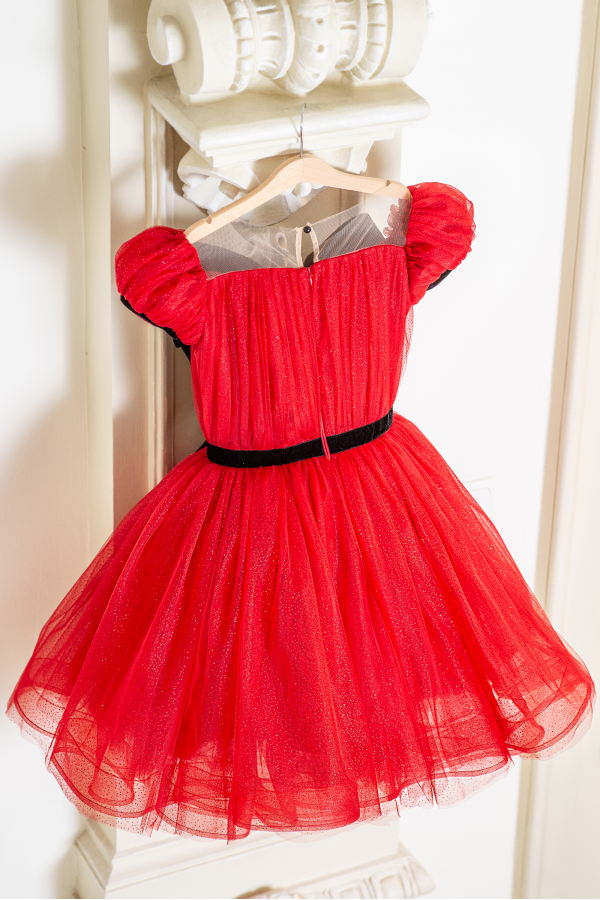 Un model perfect de rochie pentru sarbatorile de iarna, care combina nuante puternice de rosu si negru, tul sclipitor si o funda supradimensionata din catifea.