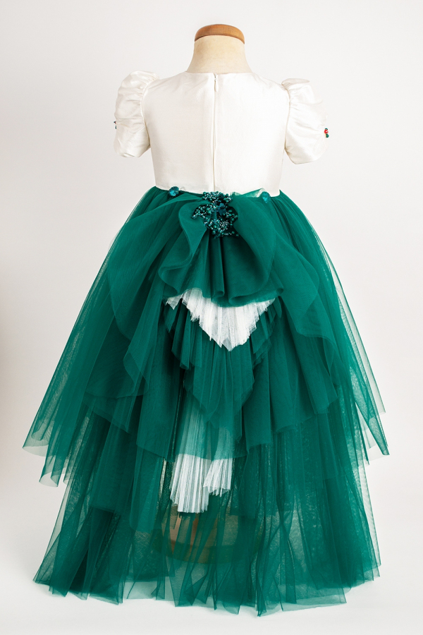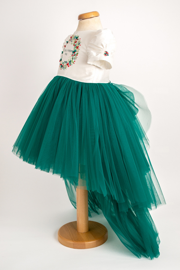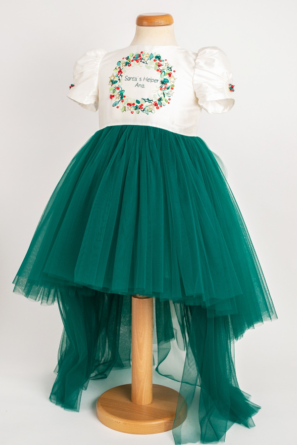 Oare de cate ajutoare are nevoie mosul pentru a putea pregati atatea cadouri? Ana s-a oferit imediat sa-l ajute si s-a imbracat intr-o rochita de matase cu trena detasabila din straturi de tul verde si accesorizata cu margelute delicate. Rochita este pictata manual si este diferita de toate celalalte pentru ca este personalizata cu numele ei, pentru ca Mosul sa isi poata chema usor ajutoarele :).