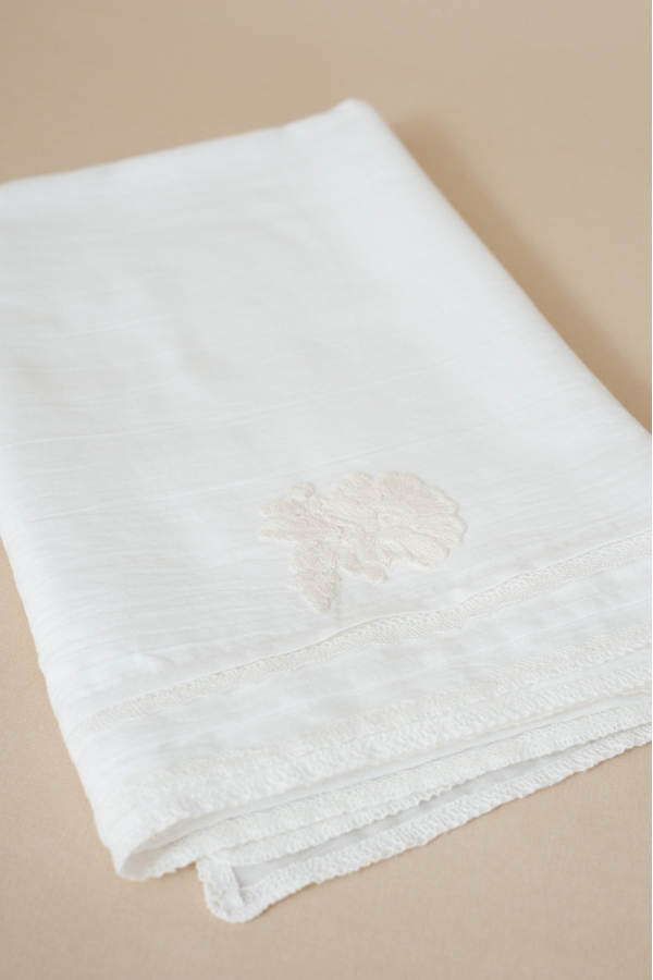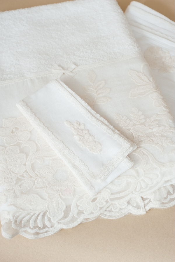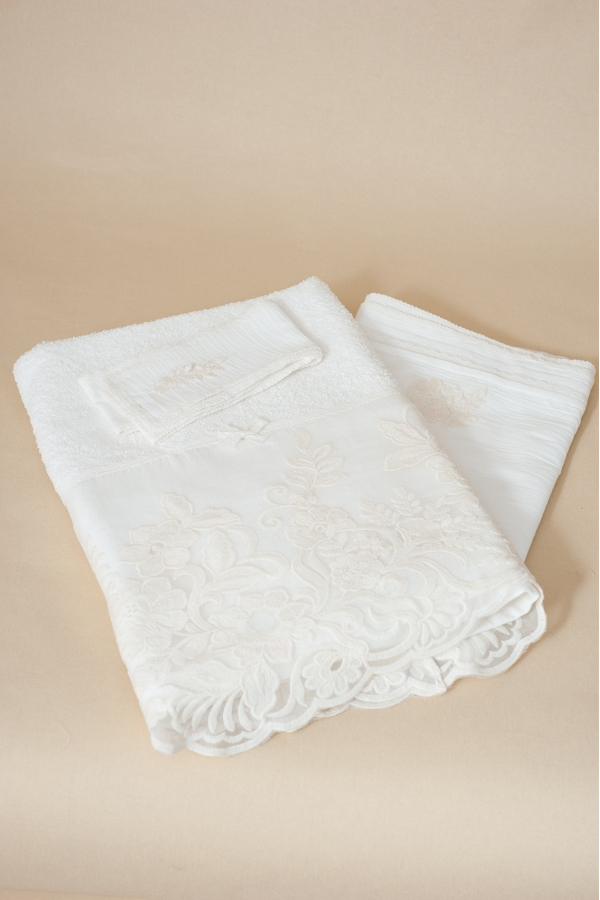 Un set pentru bebe decorat cu voal de matase brodat si dantela fina. Setul contine un prosopul mare pentru bebe, o panza de mir netivita si o fasa.