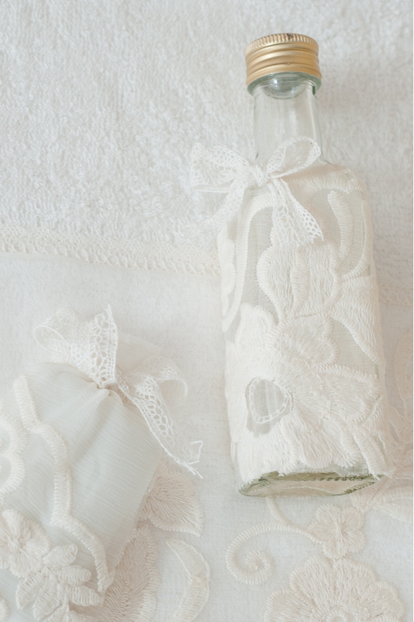 Set pentru preot decorat cu voal de matase. Setul contine prosopul pentru preot, sapunul si sticla pentru mir.