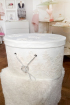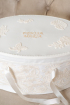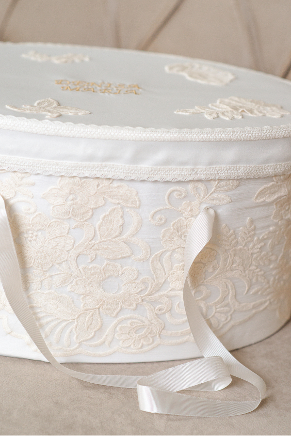 Cutie pentru trusoul de botez, decorata cu voal fin de matase brodata cu flori din bumbac.