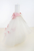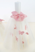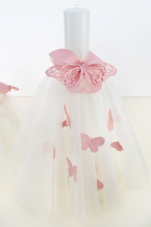 Lumanare de botez, imbracata in straturi diafane de tul, cu trena si decorata cu fluturi jucausi.